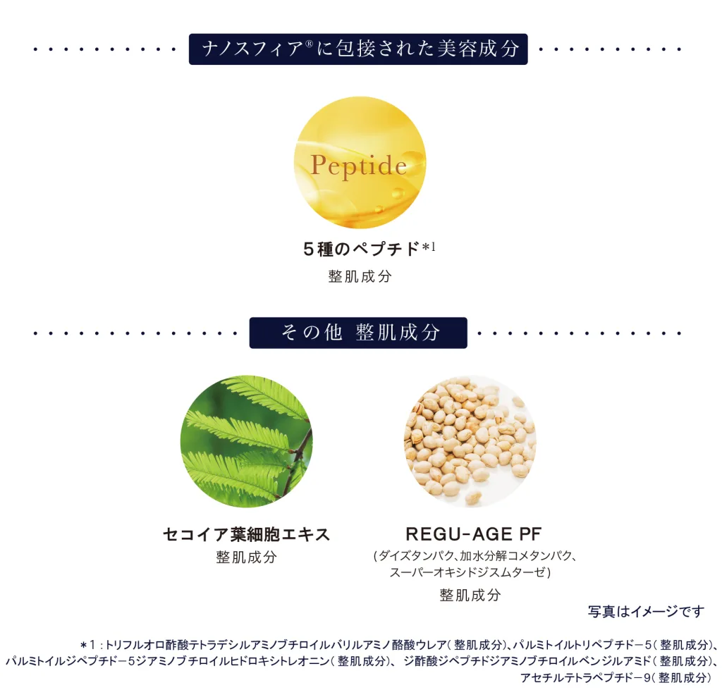 *3:トリフルオロ酢酸テトラデシルアミノブチロイルバリルアミノ酪酸ウレア(整肌成分)、パルミトイルトリペプチド-5(整肌成分)、パルミトイルジペプチド-5ジアミノブチロイルヒドロキシトレオニン(整肌成分)、ジ酢酸ジペプチドジアミノブチロイル ベンジルアミド(整肌成分)、アセチルテトラペプチド-9(整肌成分)